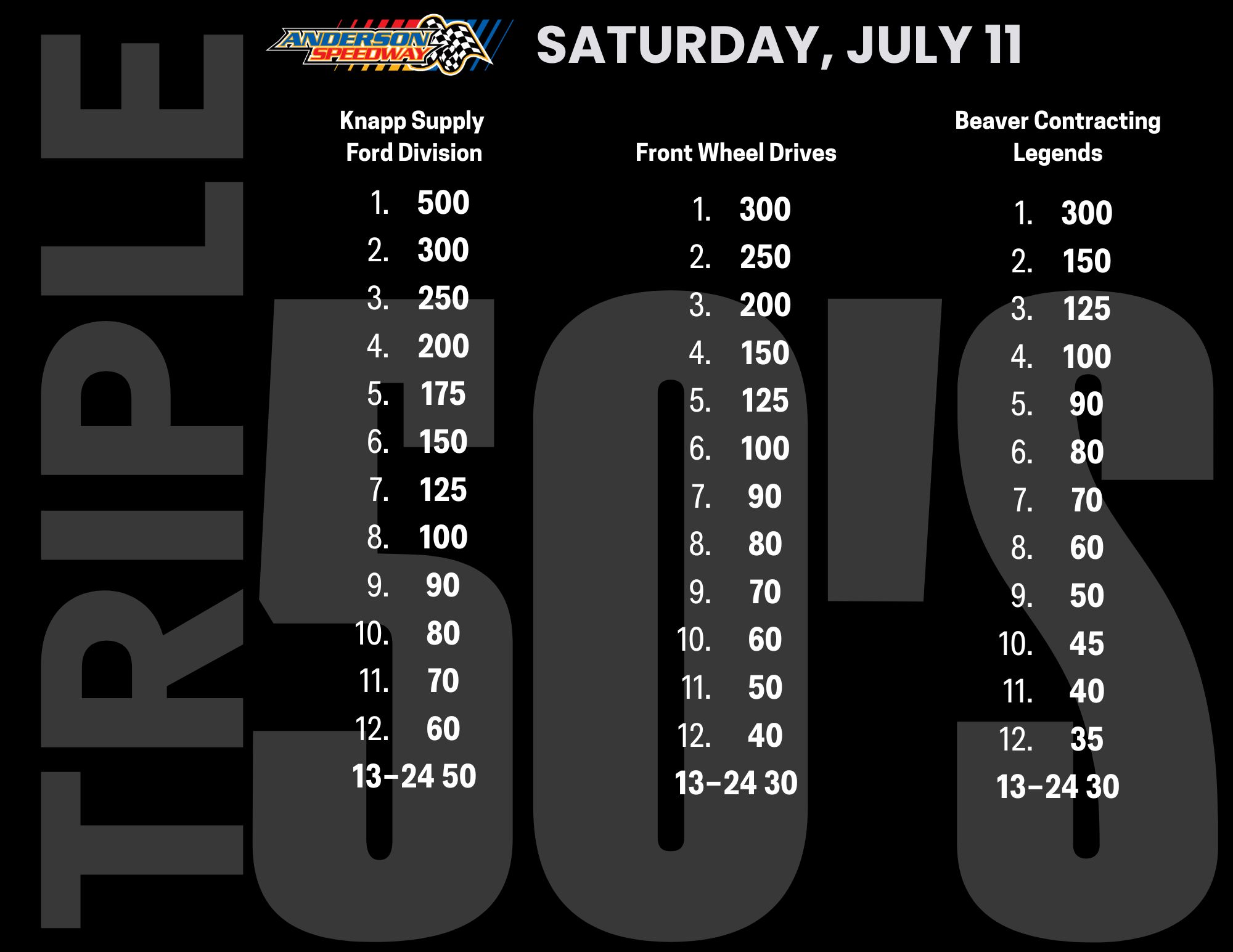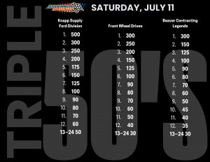 - Divisions: Knapp Supply Ford Division 50, FWD 50, Beaver Contracting Legends 50, Beaver Contracting Thunder Roadsters
